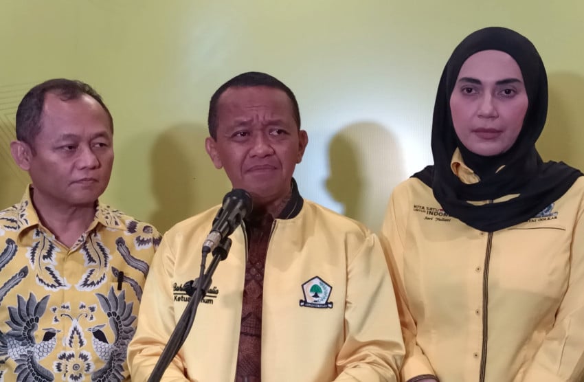 Ketua Umum Partai Golkar Bahlil Lahadalia (Ditengah) bersama Sekjen M. Sarmuji (kiri) dan Bendahara Umum Sari Yuliati. Foto/Felldy Utama