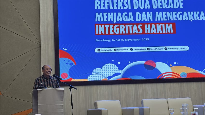Ketua Komisi Yudisial Amzulian Rifai Di Kegiatan Sinergitas Komisi Yudisial dan Media Massa: Refleksi Dua Dekade Menjaga dan Menegakkan Integritas Hakim Ke Bandung, Jawa Barat. Foto/Muhammad Fadli Ramadan