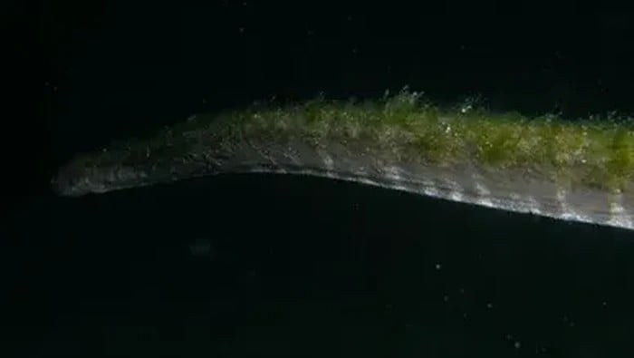 Untuk video yang dibagikan John Roney, ular kantong belang atau ‘ular file laut’ terlihat berwarna hijau dan tubuhnya tertutup alga.